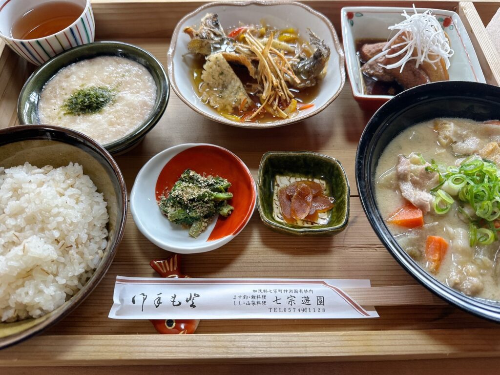 【2月のお品書き】本みりん角煮/鱒の唐揚げ彩り野菜庵かけ~おこげ添え~/白みそ豚汁/麦飯/守口漬け/擦りたてとろろ/菜の花の胡麻和え ¥2,000