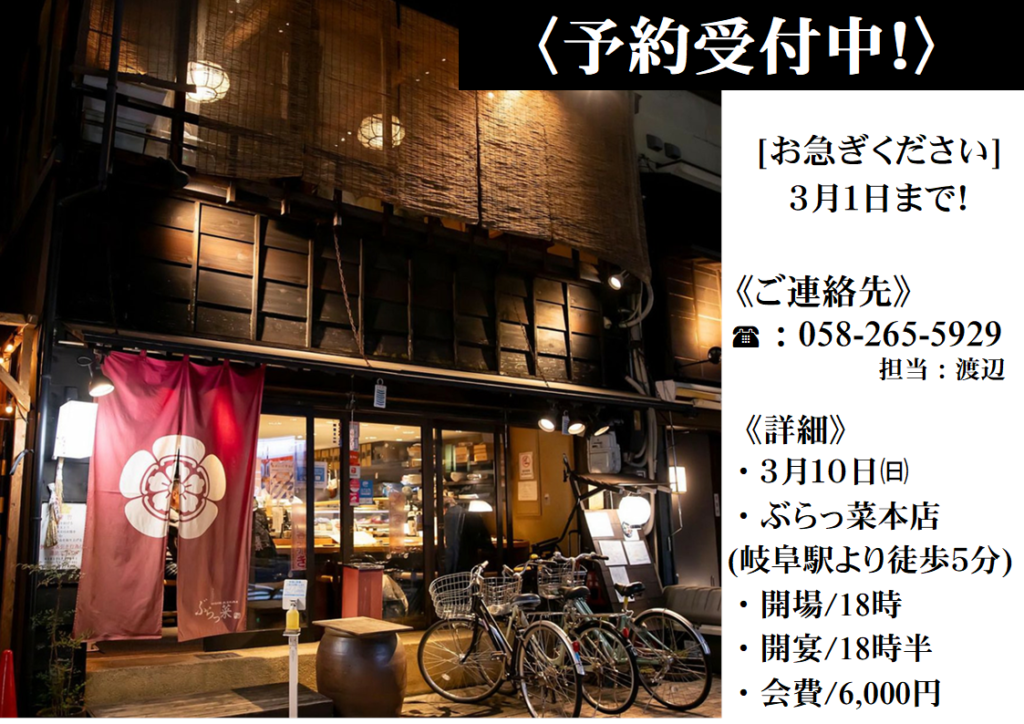 「ぶらっ菜」×「黒松白扇」~旬菜旬魚×日本酒~ 2024年2月25日2024年3月7日 イベント情報 〈当日のコースメニュー〉※予定 ◆季節の前菜 ◆市場直送 新鮮旬魚 刺盛 ◆季節野菜のシーザーサラダ ◆旬魚のゆずみそ焼き ◆岐阜県産 ボーノポークステーキ~オニオンソース~ ◆春の炊き込みご飯 ◆手作りデザート 〈当日の黒松白扇〉※予定 ◇特別本醸造 ◇純米酒 ◇特別純米酒 ◇純米吟醸 「ぶらっ菜本店」 関連記事: 関連する記事は投稿されていません URL Copied! 白扇酒造のイベント情報やお得な情報はSNSでも発信中です Instagram facebook X(twitter) LINE メルマガ 白扇酒造 季節のおすすめ