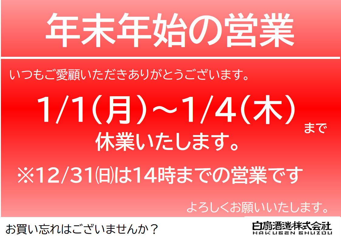 〈年末年始の発送についてのご案内〉 2023年12月18日 白扇ニュース いつもご愛顧・ご愛飲いただきありがとうございます。 以下のように、予定しております。お届け物をお考えのお客様、ご確認ください。 また、川辺店舗については以下の営業日です。 良い年末年始をお過ごしください。 関連記事: 関連する記事は投稿されていません URL Copied! 白扇酒造のイベント情報やお得な情報はSNSでも発信中です Instagram facebook X(twitter) LINE メルマガ 白扇酒造 季節のおすすめ