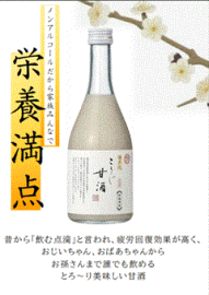 昔から「飲む点滴」と言われ、疲労回復効果が高く、おじいちゃん、おばあちゃんからお孫さんまで誰でも飲めるとろ~り美味しい甘酒です。